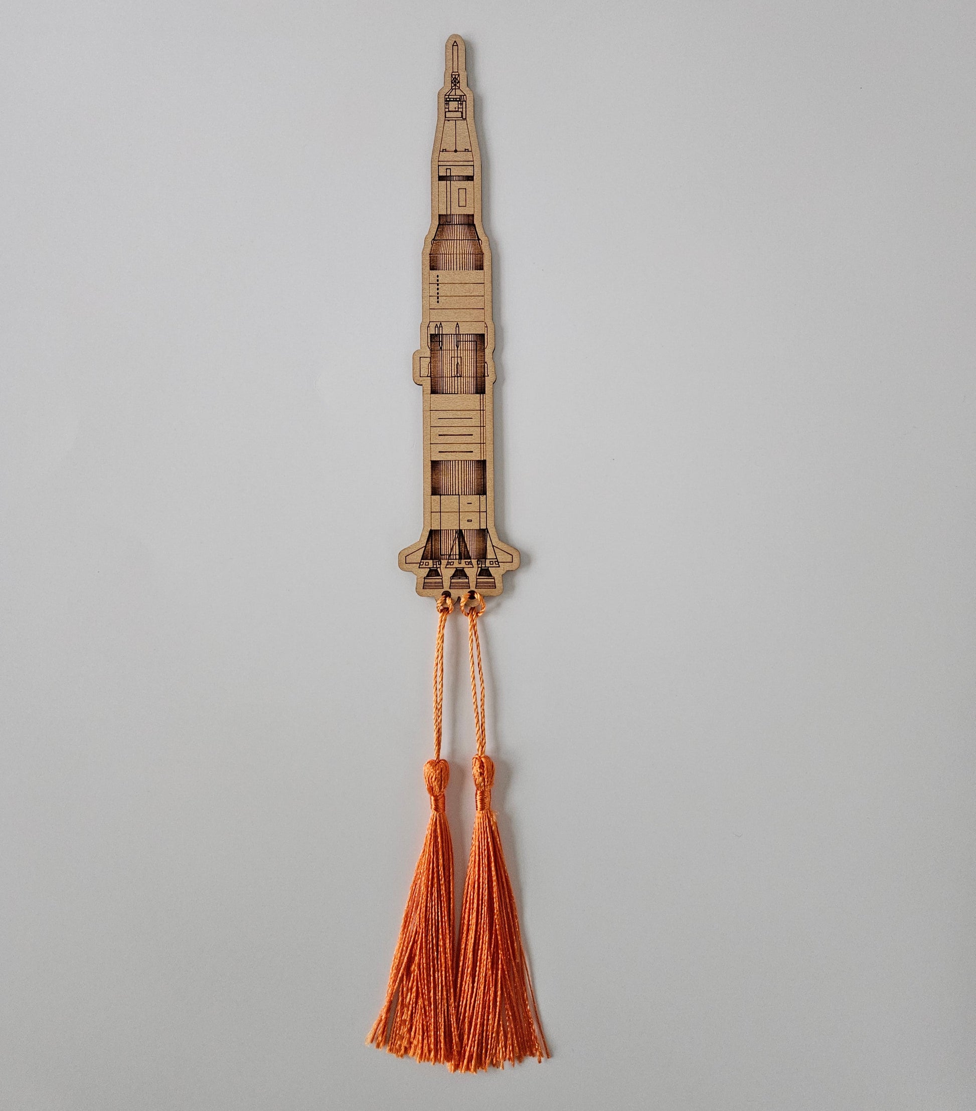 A gift for teachers, children and readers of all ages who like space travel themes. This detailed laser-engraved replica of the workhorse rocket that carried astronauts to the moon will remind kids young and old that the sky is no longer the limit when it comes to reading. The dual-tassel design looks like it's blasting off into the next frontier. The wood bookmark measures just over 7 inches long (185mm) and about 1 1/2 inches at the widest part.